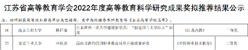 近日,江苏省高等教育学会发布了2022年度高等教育科学研究成果奖的获奖结果,开元网站登录入口林祥瑜副教授的学术论文《日本世界一流大学建设新举措:“指定国立大学法人”制度》(《江苏高教》)和汪欣欣博士的学术论文《面向非洲的我国职业教育对外开放政策研究》(《中国职业技术教育》)分别荣获二等奖。
