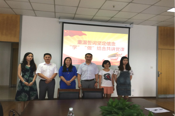 活动第一项内容是展示手抄誓词、重温入党誓词。全体党员怀着无比崇敬的心情,在双方支部最年轻党员陶丹敏同志领誓下,面对鲜红的党旗,举起右拳,庄严宣誓;活动第二项内容是党员主讲党课、全员参与讨论。佴康副书记作动员讲话指出,“学”“做”结合共讲党课对于深入开展“两学一做”学习教育、坚定理想信念做一名合格党员具有重要意义。学生党员首先开讲。孙晓洁以“光辉党史照千秋”为题回顾了党的发展历程,陶丹敏结合“一带一路”倡议作了题为“党旗飘飘,党心悠悠”的报告,闫倩倩从建党节的由来讲起,带领大家“忆党史,展未来”。杨洪俊老师就每位学生党员所讲党课中存在的问题提出了中肯建议。孔子学院办公室主任吕建高教授以法治为重点,结合国情,呼吁大家“努力在工作与生活中践行社会主义法治观念”。党课结束后,大家纷纷联系实际提出自己的观点,做到了全员参与讨论。活动最后,缪克明书记对双方共建活动给予了充分肯定,同时希望支部共建能积极“走出去”,了解社情民意、参与地方建设、加强党性锻炼、增强党性修养,并认为这既是校部机关深入落实“仁爱与责任”的要求,也是学生党员提前接触社会、在党组织怀抱下快速成长的机会。