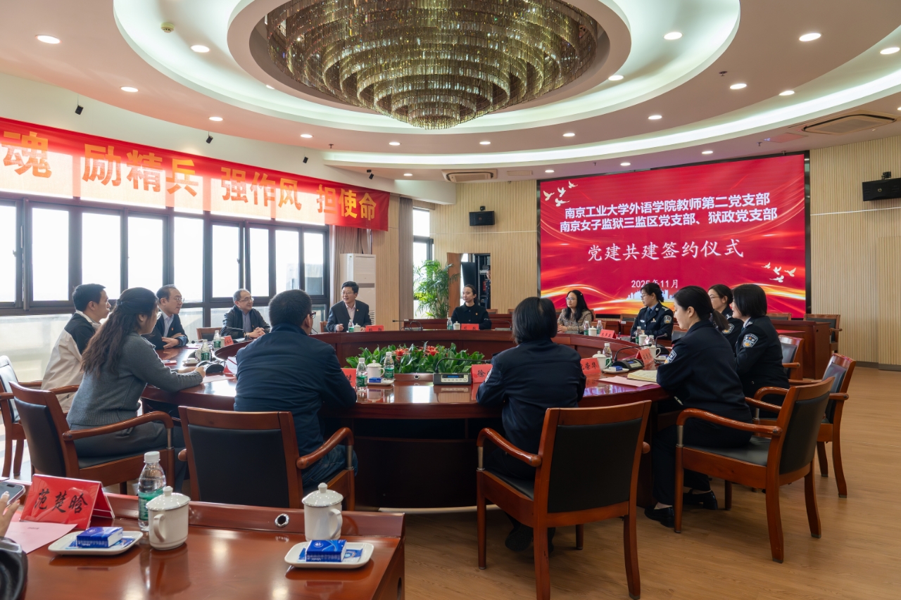江苏省南京女子监狱党委副书记、纪委书记王庭兰介绍了女子监狱概况和“四强”党支部建设成果,展示了强化党建引领锻造过硬队伍的典型案例,表达了深化校监合作的愿望。学院党委书记张翔介绍了学院在人才培养、文化传播和党建活动等方面取得的成果,表示将积极搭建互动交流的平台,通过党支部共建凝聚发展合力,深入推进校监合作。外语学院教师第二党支部和女子监狱三监区党支部共同签订支部共建协议。