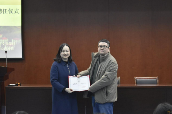 首先,李田田老师向参会人员介绍张鹏飞校友在疫情期间的助人事迹,代表学院感谢他对学院工作的支持与帮助。随后,高洁副书记为张鹏飞校友颁发导师聘任书,并由学生代表献花和佩戴校徽。