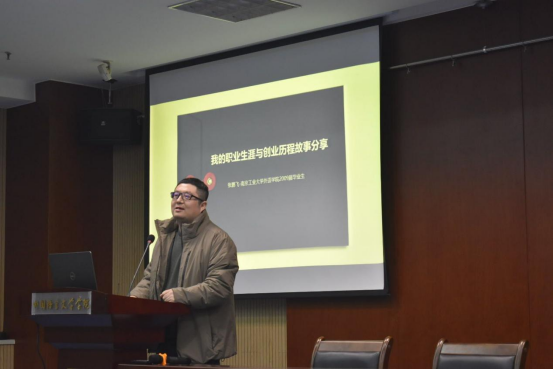 仪式结束后,张鹏飞校友围绕个人的职业生涯和创业经历发表演讲。演讲中,张鹏飞校友他就人生处事与职场生活两方面提出了建议,同时勉励学生们要不畏困难,艰苦奋斗;要开阔眼界,广交好友。