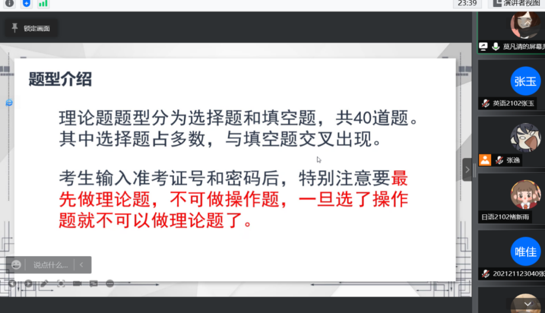 接着,吴倩同学细致地讲解了全国计算机应试的注意点,对前面的分享进行了有益补充,分享了无纸化理论题,并强调了备考时练习的重要性。