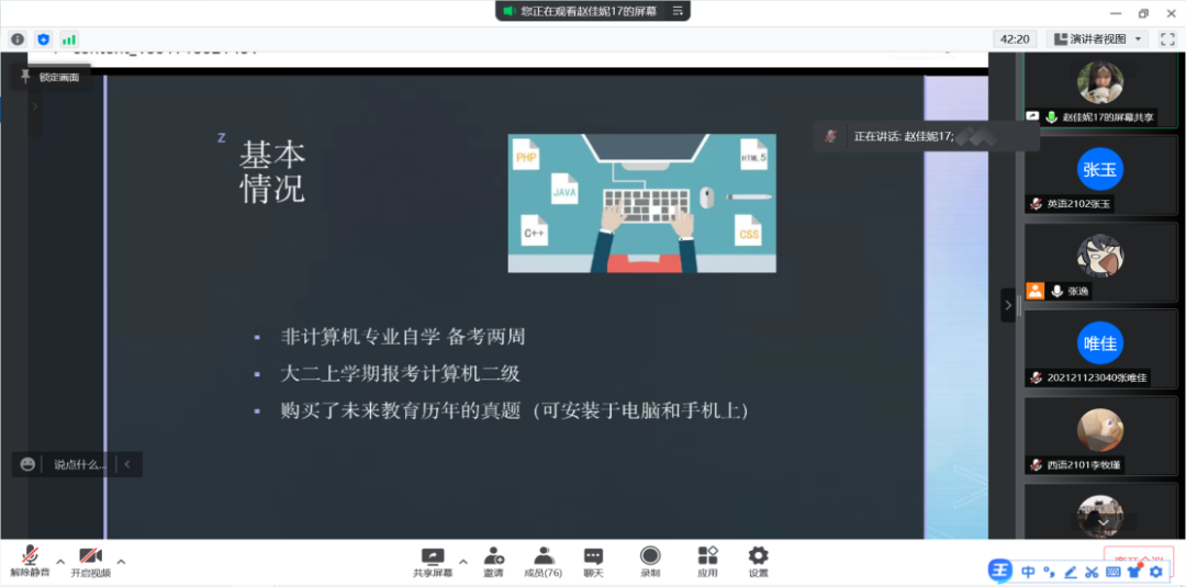 赵佳妮同学结合我院的计算机学习情况,分享了她考试前的前两周的备考方案,进行了真题推荐。