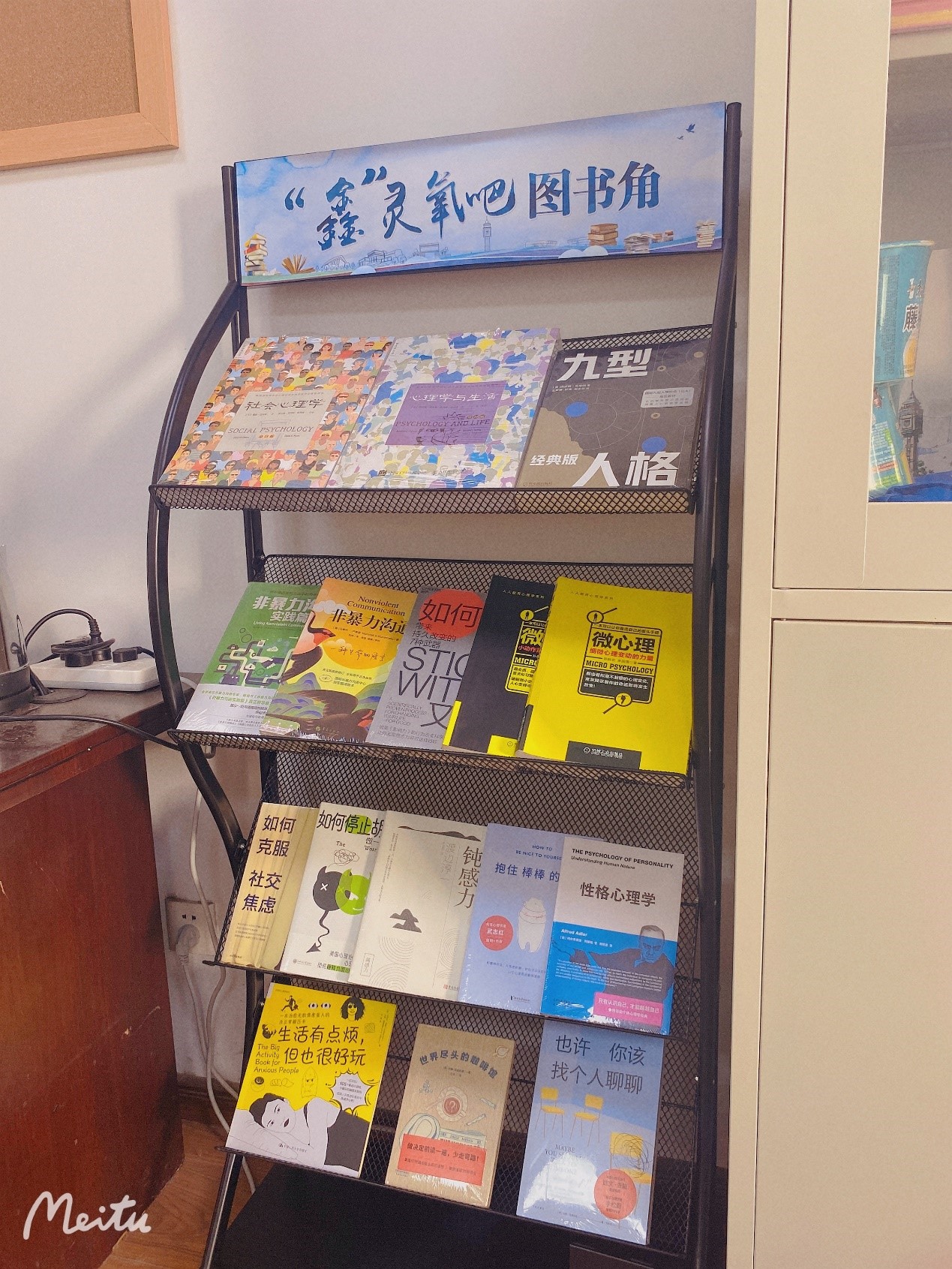 学习心理健康知识是了解自我,缓解心理困惑、开发心理潜能、提升心理品质、促进人格健全的最好途径。在校心理健康教育指导中心的指导下,外语学院购置了一批心理健康教育的书籍,并集中在“鑫”灵氧吧图书角摆放,其中收录的书籍有《如何停止胡思乱想》、《世界尽头的咖啡馆》、《也许你该找个人聊聊》、《抱住棒棒的自己》、《蛤蟆先生去看心理医生》、《社会心理学》、《心理学与生活》、《九型人格》、《如何想到又做到》、《如何克服社交焦虑》 《钝感力》、《性格心理学》、《生活有点烦,但也很好玩》等。学院组建了图书角管理团队,专门负责图书的借阅工作,同时还将不定期组织读书分享会。