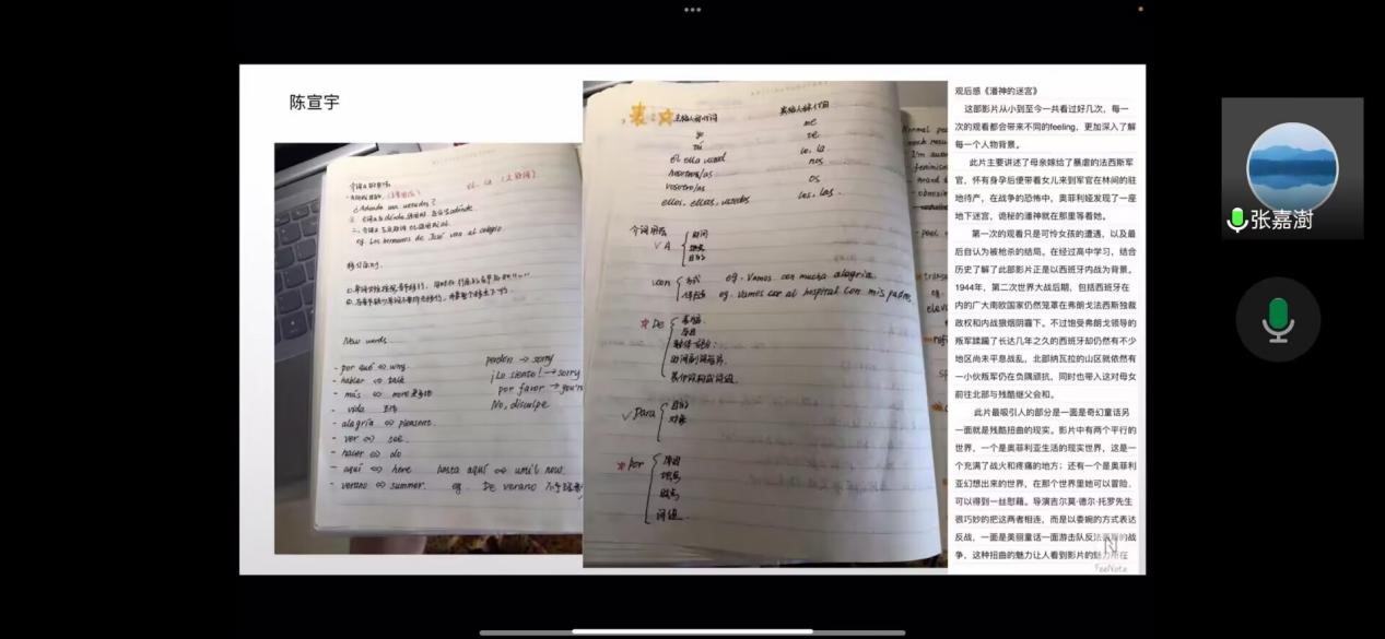 在线上读书分享会中,日语2202班赵云怡通过对《长恨歌》中女主角王琦瑶命运的探析,传递出女孩子应该爱自己,爱父母,爱别人的大格局;英语2202班张妍同学《the five people you meet in heaven》的读书笔记中,传达出了她对生命中所出现的人的思考以及相信所有意义的存在。汉语2201班许周熹读《花未眠》有感而发,她分享道,自然之美是无限的,但人能感受到的自然之美是有限的,希望我们都能在不同角落发现别样的光;西语2201班陈宣宇观看电影《潘神的迷宫》后,深刻感受到了西语的魅力,直观地感知了西班牙的历史,她还就如何培养语言兴趣、掌握西语学习方法与同学们深入交流。