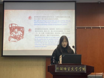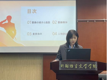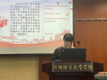 活动之初,王钰棨向与会人员介绍本次活动的背景意义,她指出60年来,雷锋精神一直激励着一代又一代的中华儿女,我们要将学雷锋活动融入日常、化作经常,让雷锋精神在新时代绽放更加璀璨的光芒。随后,五位学生代表分别运用西班牙语、德语、英语、日语、汉语等所学语种,就自己对雷锋精神的理解进行分享。