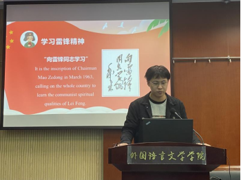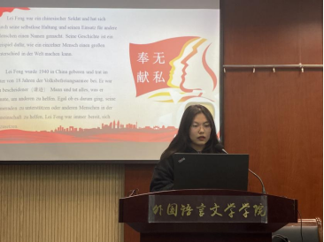 西语2101班周子晗同学分享了自己对《如你》微电影的感想,歌颂了雷锋同志的伟大奉献精神。她向与会人员发出号召:“Seamos herederos del espíritu de Lei Feng.让我们一起做雷锋精神的传承人!” 德语2001班徐安琪同学介绍了雷锋同志的生平和感人事迹,她结合热点内容分享自己的观点看法,倡导青年学生从身边小事做起,积极践行雷锋精神。英语2002班顾明磊同学在介绍雷锋同志后从“知”“学”“行”三部分对雷锋精神进行剖析,带领大家品读雷锋日记摘选。汉语2201班焦梦玥、日语2002吴雪涵两位同学情感丰富饱满、演讲内容动人,向大家传达了对雷锋精神的深刻感悟。