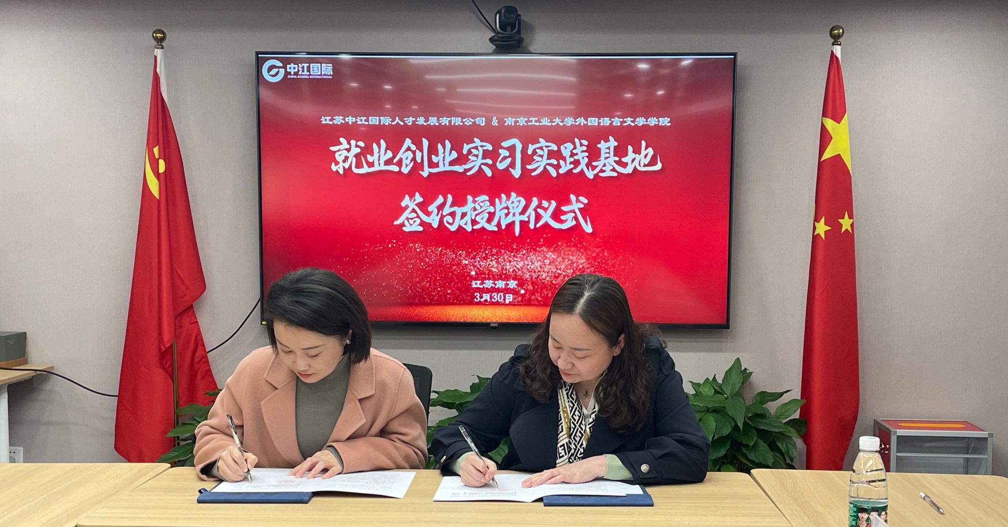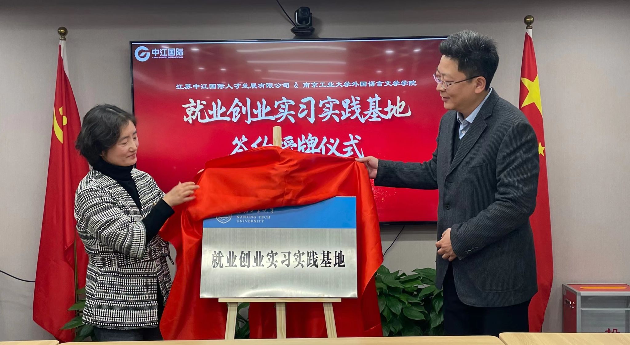 刘怡、费阳阳分别从人才强企工程、校企文化融合、职业教育培训等方面详细介绍了公司相关情况,并表示希望能与我校加大合作广度、深化合作维度。张翔向中江国际多年来对学校毕业生就业工作的关心和支持表示感谢,并详细介绍了开元网站登录入口专业建设、人才培养及国际交流等方面的情况。高洁就学院毕业生的相关情况和校企合作等方面做了介绍。双方交流热烈,共同表示愿意在人才培养、就业实习、校友引领等方面协同发力,助力语言类人才的培养。最后,双方签署了就业创业实习实践基地建设协议书,并为“南京工业大学就业创业实习实践基地”揭牌。