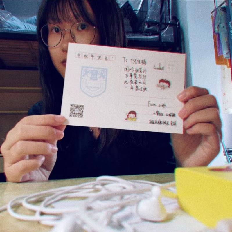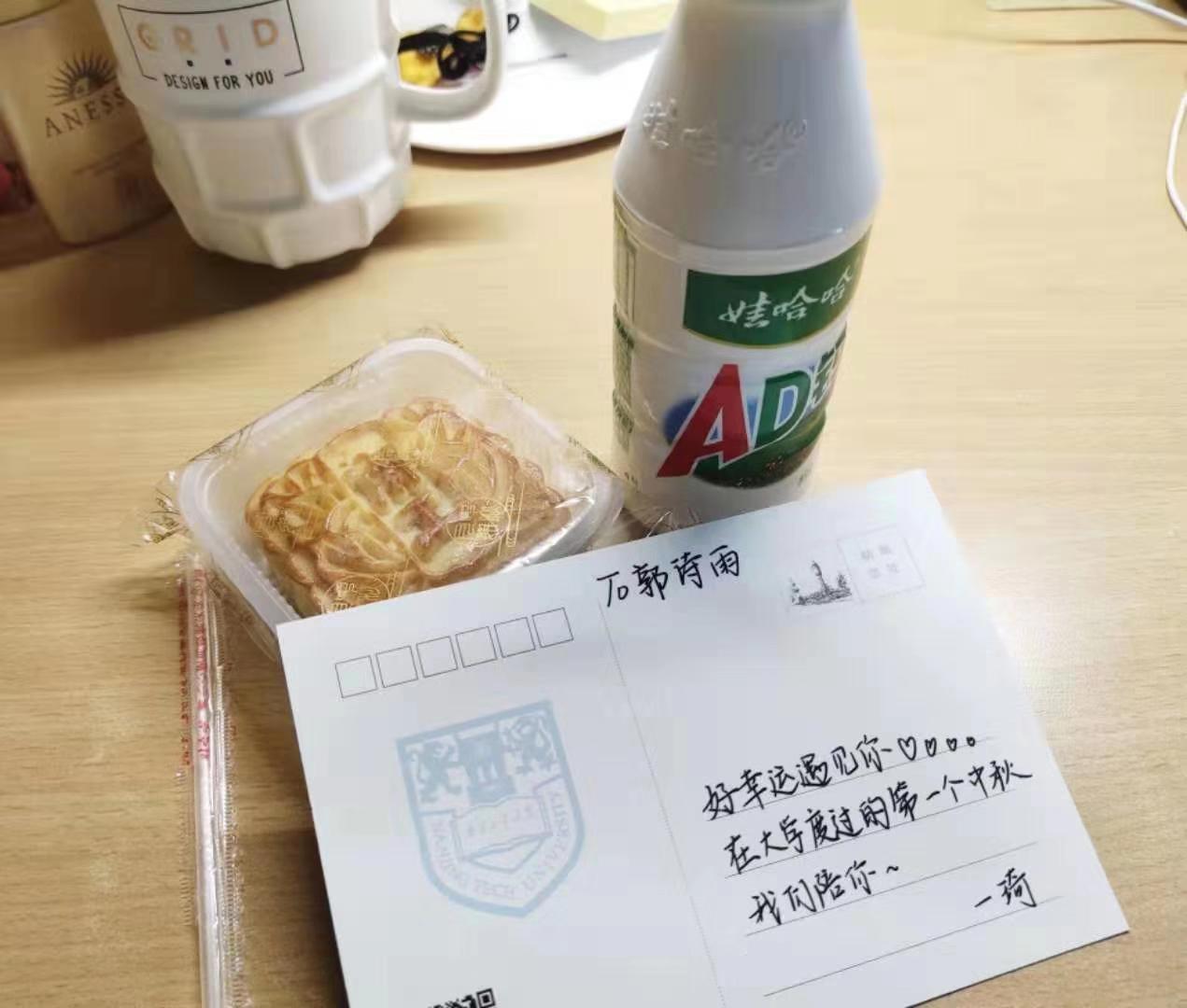 当晚,小班们走进新生宿舍,与新生们欢聚一堂,为他们送去了印有校训字样的“南工牌温暖月饼”、娃哈哈AD钙奶以及小班们亲手写的明信片。明信片上的寥寥片语,寄托了小班对新生美好的祝福。宿舍里大家如家人一般围坐在一起,话家常、赏明月,洋溢着团聚的欢乐气氛。