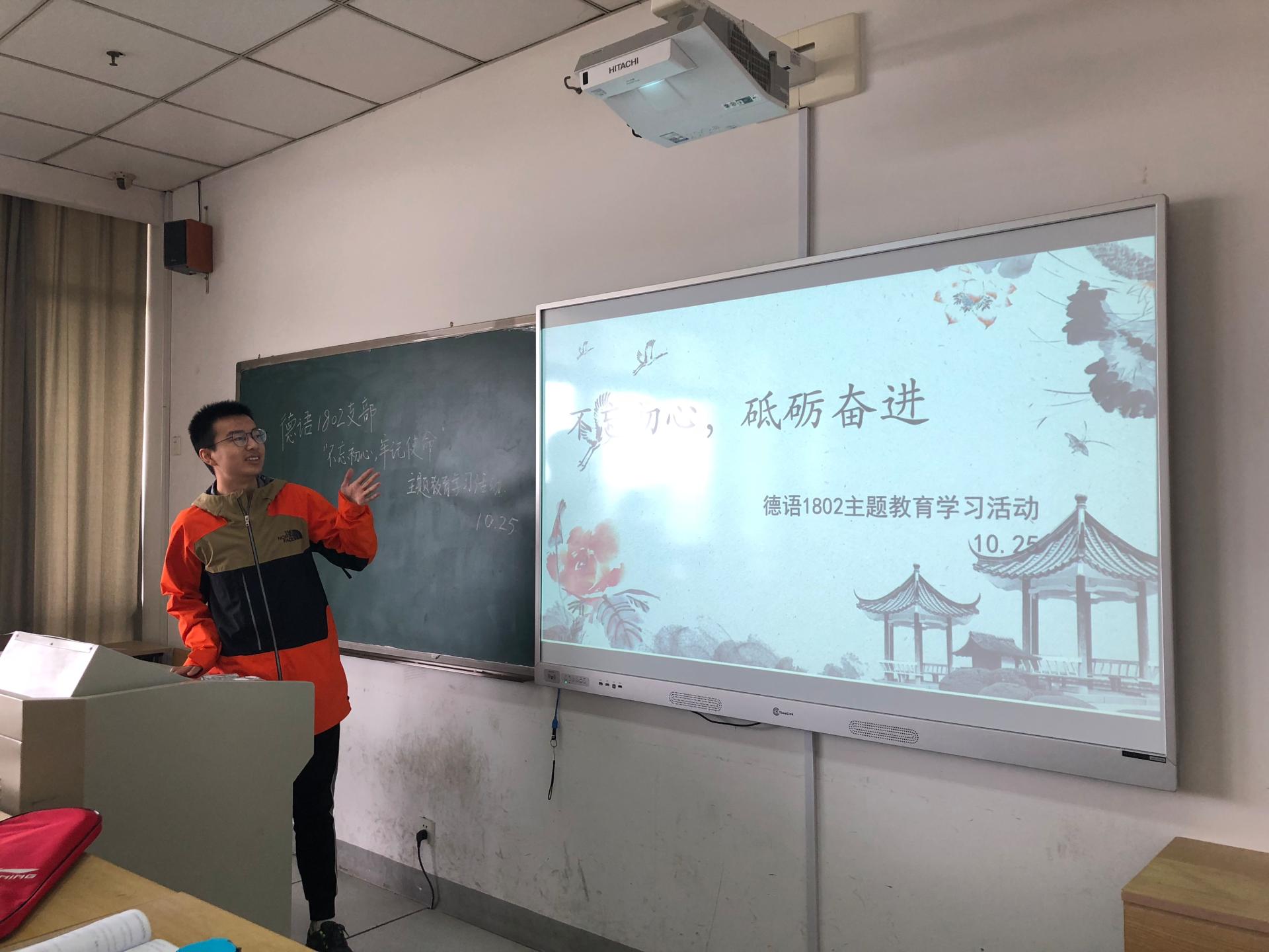德语1801团支部围绕“初心,使命,奋斗”三大主题,展开主题学习班会,学习中国共产党人的初心、使命和奋斗目标,结合自身制定未来规划和目标;德语1802团支部集体组织观看“新中国成立70周年成就展”活动,并开展“不忘初心,砥砺奋进”主题班会,观看学习微团课视频及先进团员事例等,牢固自己的理想信念,坚定自己的初心;汉语1801团支部开展党知识竞赛活动,同时结合竞赛内容,团员们进行交流讨论并上台发言分享;日语1801、1802团支部开展中山陵仪式教育主题团日活动,重温入团誓词,铭记历史,不忘初心,牢记新时代青年的使命与责任;英语1801团支部组织支部成员参观庆祝中华人民共和国70周年展览,认真学习新中国七十年来的发展变化,为祖国未来的发展贡献力量时刻做好准备;英语1802团支部开展“庆祝新中国七十周年诞辰”主题活动,进行知识竞答、诗歌朗诵等,弘扬爱国主义精神,通过文化的形式传播爱国正能量。