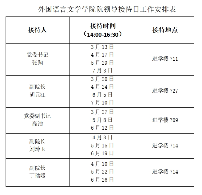 第二条 院领导接待日组织工作由学院办公室负责,学院现任院级领导轮流值班接待,接待对象为全院师生员工,接待地点为各院领导办公室,接待时间为每周三下午14:00——16:30 (节假日顺延,如遇重要会议及特殊情况,具体时间另行通知)。
